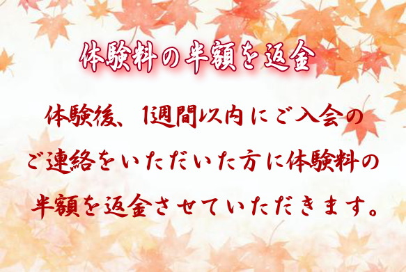 体験後一週間以内にご入会のご連絡をいただいた方に体験料の半額を返金させていただきます。